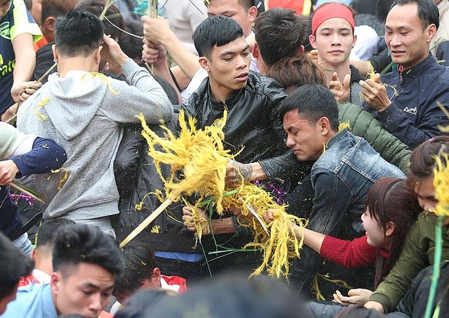 Hàng trăm người ở Vĩnh Phúc giành nhau biểu tượng bông lúa với hy vọng bội thu và may mắn cả năm.
