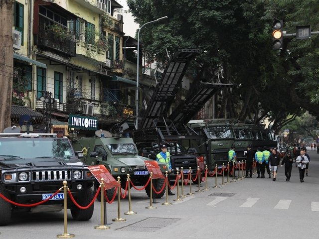 Dàn khí khí tài của lực lượng Công an nhân dân Việt Nam trưng bày tại không gian phố đi bộ hồ Hoàn Kiếm trong ngày 8 và 9-3 thu hút nhiều người dân và du khách tham quan.