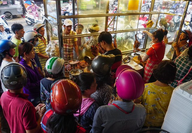 Từ sáng sớm hàng trăm người dân đã xếp hàng dài, chen lấn tràn xuống đường để mua heo, vịt quay cúng ngày vía Thần tài.