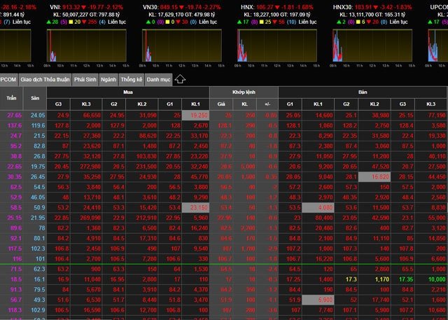 Thị trường chứng khoán rơi vào trạng thái bán mạnh, VN-Index có lúc mất hơn 27 điểm khi mở cửa phiên chiều.