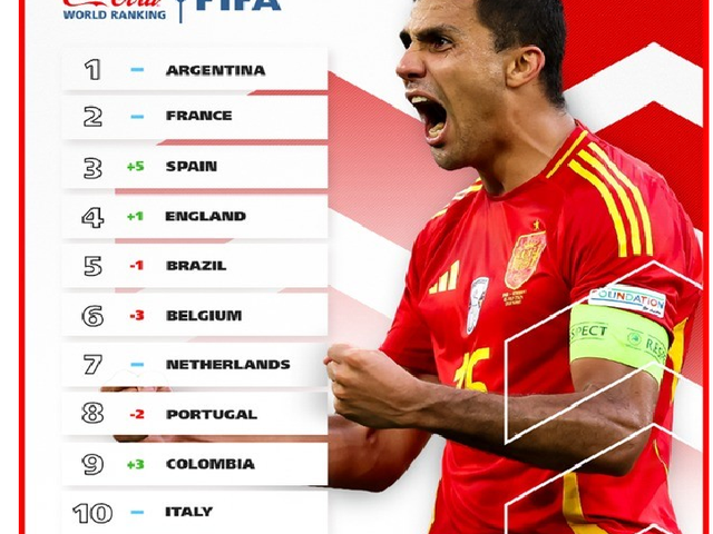 Với chức vô địch EURO 2024, đội tuyển Tây Ban Nha vươn lên mạnh mẽ trên bảng xếp hạng FIFA, nhưng cũng chỉ đứng thứ 3.