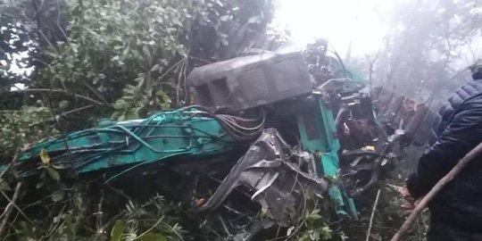 Chiếc xe tải chở máy xúc gặp đoạn đường dốc, không tiến lên được, tài xế đã lùi xe thì tông vào taluy âm khiến cả 2 chiếc xe cùng lao xuống vực sâu làm tài xế xe tải tử vong, 3 người bị thương.
