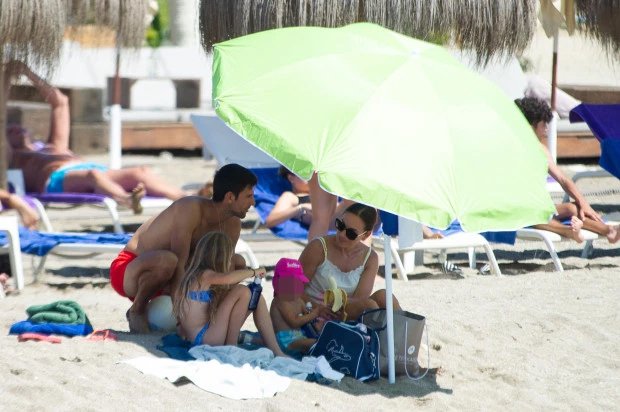 Tay vợt số một thế giới chèo thuyền, tập yoga trên bãi biển khi cùng bà xã Jelena và hai con đi nghỉ ở Marbella, Tây Ban Nha, hôm 29/7.