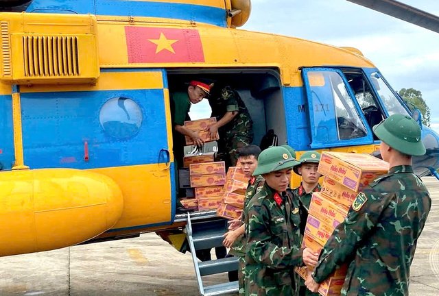 Sáng 24/7, hai chuyến trực thăng đầu tiên do Bộ Quốc phòng điều động đã đáp xã Tương Dương, tiếp tế nhu yếu phẩm cho các điểm bị cô lập do lũ.