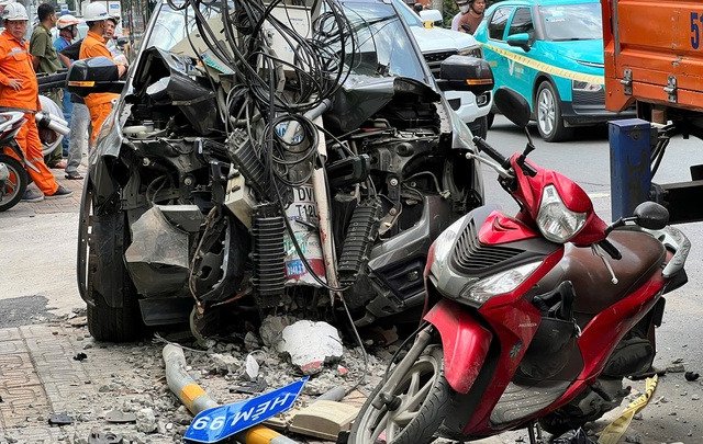 Xe bán tải lao lên vỉa hè, tông gãy trụ điện, 1 người chết
