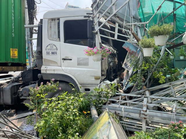Nhiều người đang ăn cơm trưa đã hoảng hốt xô đổ bàn ghế tháo chạy khi thấy chiếc xe đầu kéo kéo rơ-mooc chở contrainer lừng lững lao vào…