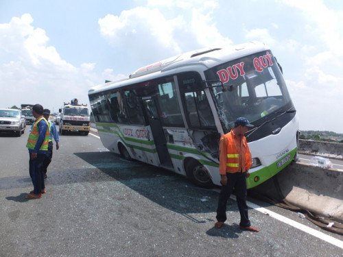 <strong>Sau cú va chạm giữa chiếc xe đầu kéo và xe khách đang lưu thông trên cao tốc TPHCM-Trung Lương, chiếc xe khách mất lái lao lên, nằm vắt vẻo trên dải phân cách giữa cao tốc.</strong>