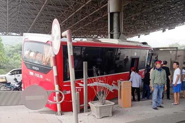 Chiếc xe khách đang lưu thông trên quốc lộ 1A bất ngờ lao vào trạm thu phí Bỉm Sơn khiến 5 người bị thương.