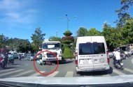 <b>Đang sang đường, người đàn ông điều khiển xe máy bất ngờ bị xe bồn đâm trúng. May mắn, tài xế ô tô đã kịp dừng lại trước khi cuốn nạn nhân vào bánh xe.</b>