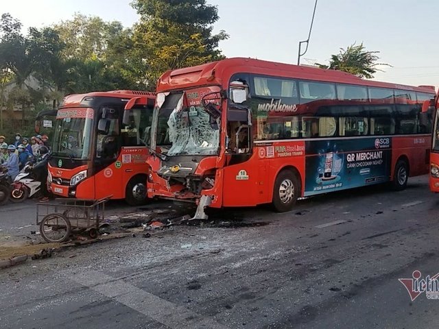 Xe khách đâm nhau vỡ nát lúc dừng đèn đỏ ở TP.HCM, 5 người bị thương