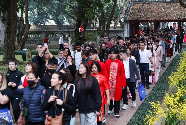 Du xuân mùng 1 Tết Bính Ngọ, đông đảo người dân Thủ đô đến thăm khu di tích Văn Miếu - Quốc Tử Giám, đặc biệt khu vực xin chữ luôn có đông người xếp hàng chờ.