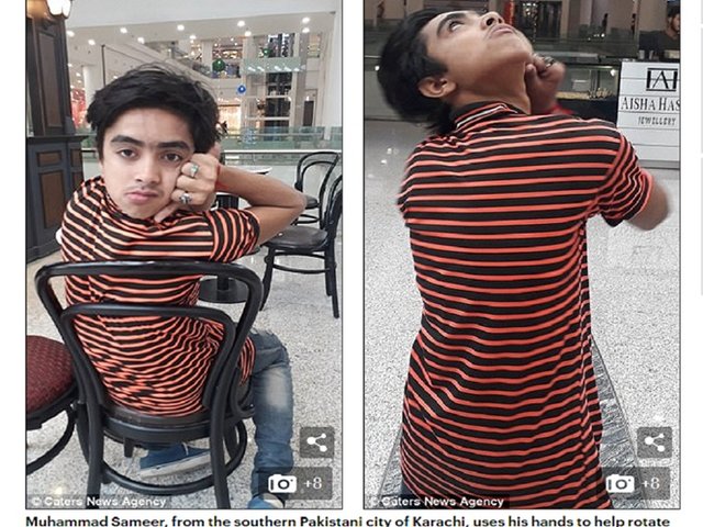 Sameer Khan, 14 tuổi, sở hữu một chiếc cổ ‘cao su’ cho phép em có thể xoay ngược đầu 180 độ ra phía sau. Mỗi ngày, cậu bé người Pakistan này vẫn tập luyện đều đặn để duy trì độ dẻo dai của cơ thể.