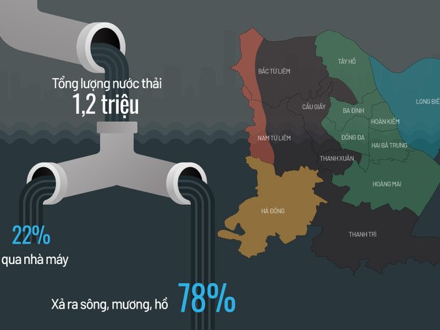 Chỉ 22% nước thải được xử lý qua nhà máy, còn lại 78% xả thẳng ra sông mương, theo Công ty thoát nước Hà Nội.