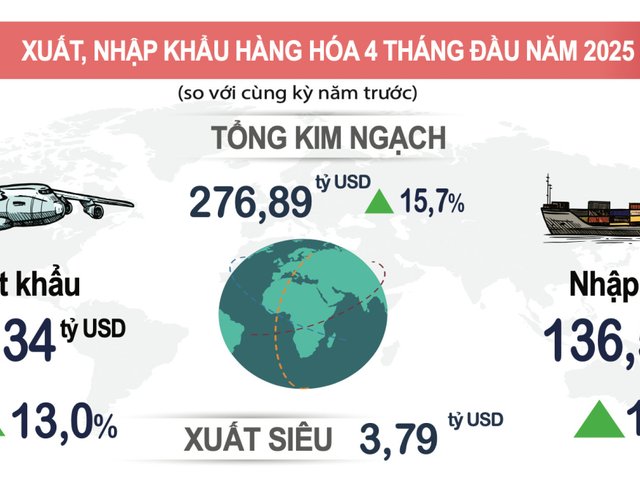 Theo Cục Thống kê, tính chung 4 tháng đầu năm 2025, tổng kim ngạch xuất, nhập khẩu hàng hóa của cả nước đạt 276,89 tỷ USD, tăng 15,7% so với cùng kỳ năm trước; trong đó xuất khẩu tăng 13%; nhập khẩu tăng 18,6%.