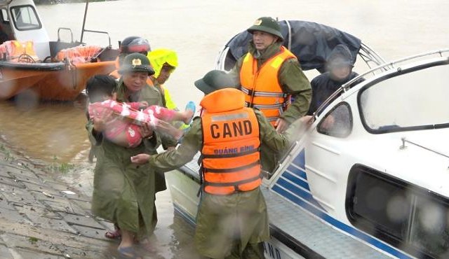 Để cứu các nạn nhân bị thương trong lũ, lực lượng cứu hộ phải vượt lũ sông Gianh bằng cano, sau đó kết hợp bè chuối để vận chuyển các nạn nhân ra ngoài.