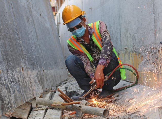 Ngày cuối năm ở dự án hầm chui Nguyễn Văn Linh - Nguyễn Hữu Thọ và nâng đường Nguyễn Hữu Cảnh, hàng chục công nhân miệt mài làm việc, chờ Tết trên công trường.