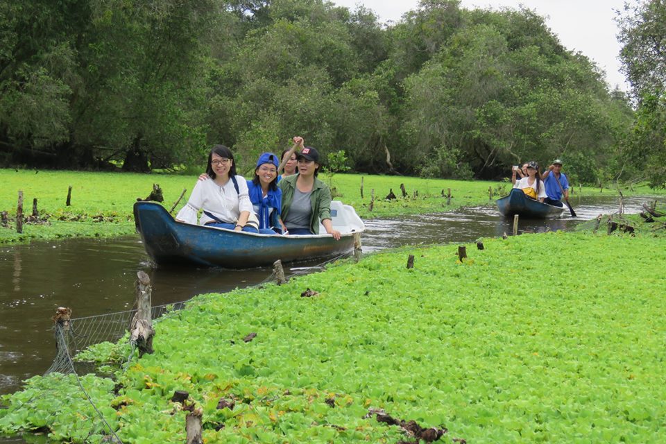 Sau khi mua vé tham quan, bạn sẽ được lên xuồng máy đi sâu vào trong. Tiếp đó, di chuyển sang xuồng chèo tay len qua những lớp bèo tấm xanh mướt để tham quan.