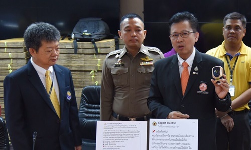 | Đại diện Cơ quan Phòng chống Tội phạm và Bảo vệ Người tiêu dùng Thái Lan cầm trên tay thiết bị tiết kiệm điện giả mạo được quảng cáo trên trang Facebook Expert Electric. Ảnh: Bangkok Post. |