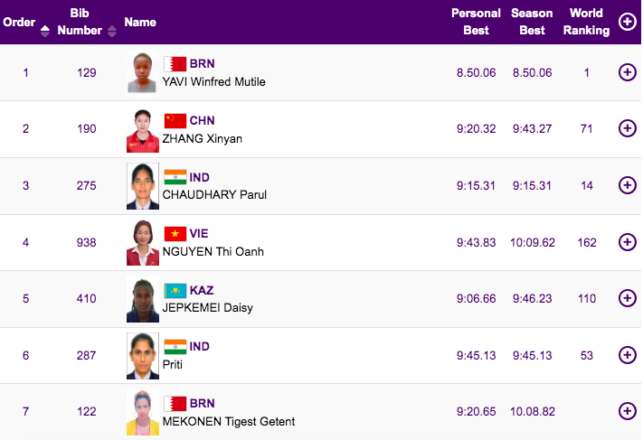Xếp sau đương kim vô địch Yavi là Daisy Jepkemei người Kazakhstan với thông số tốt nhất là 9 phút 06 giây 66. Kế đó là Parul Chaudhary (Ấn Độ, 9 phút 15 giây 31), Xinyan Zhang (Trung Quốc, 9 phút 20 giây 32), Tigest Getent Menkolent (Bahrain, 9 phút 20 giây 65)...