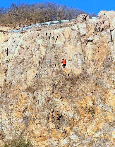 Thanh niên tay không leo vách núi lên đồi Con Heo trước khi bị rơi. Ảnh: Chau Vo.