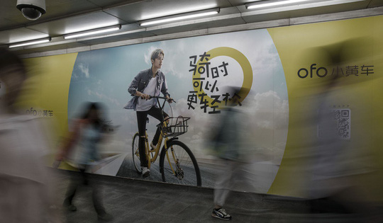 Bảng quảng cáo của công ty chia sẻ xe đạp Ofo tại một ga tàu điện ngầm ở Bắc Kinh Ảnh: Bloomberg