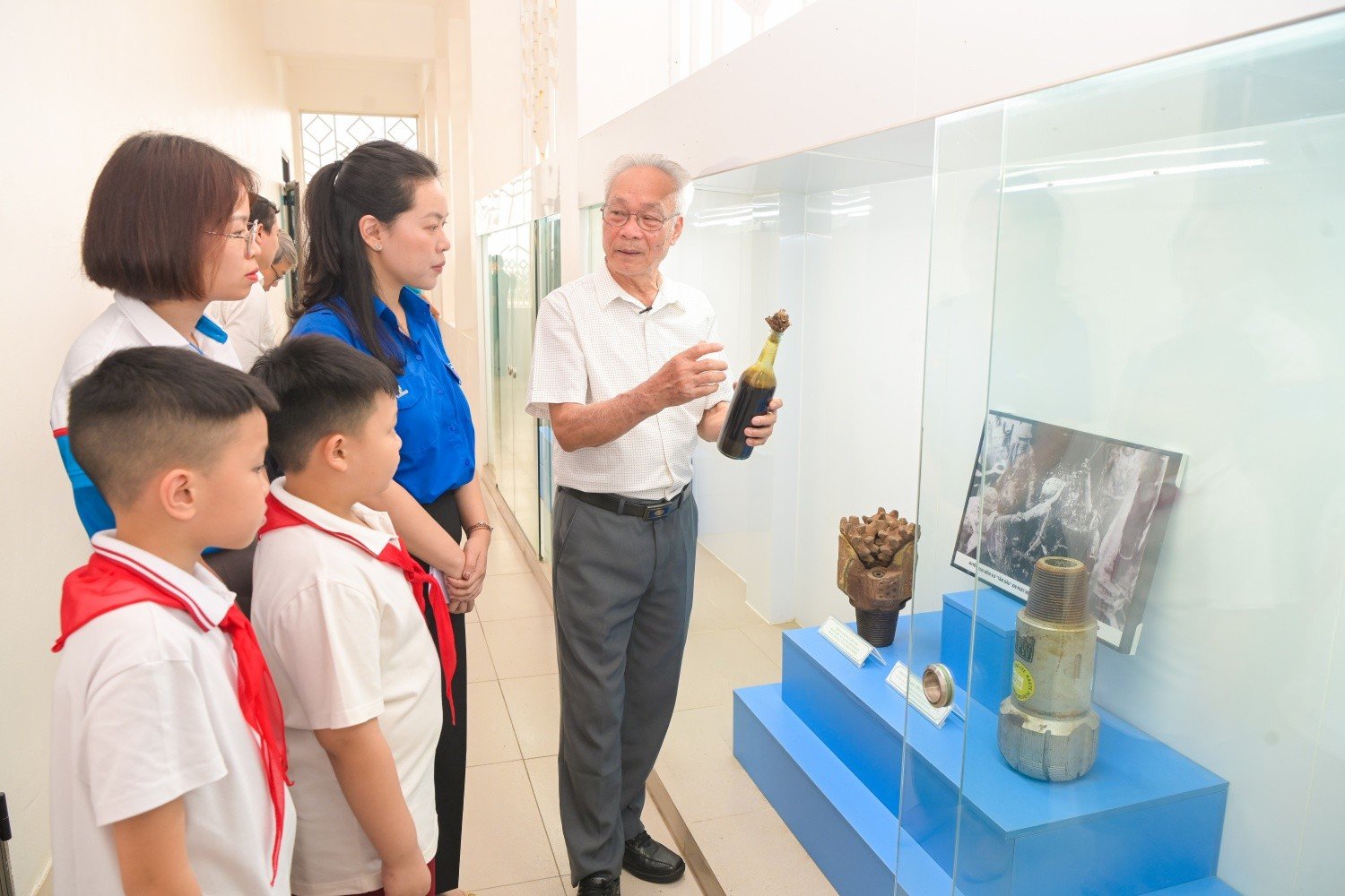 Ông Nguyễn Xuân Nhự - nguyên Vụ phó Vụ Dầu khí, Văn phòng Chính phủ, chia sẻ cho cán bộ, đoàn viên, các em nhỏ về những hiện vật dầu khí.
