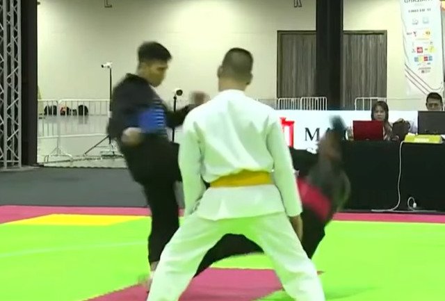 Vận động viên Malaysia dùng đòn hiểm phạm luật nhưng được trọng tài xử thắng, mặc kệ võ sĩ Việt Nam nằm bất động trên sàn đấu.