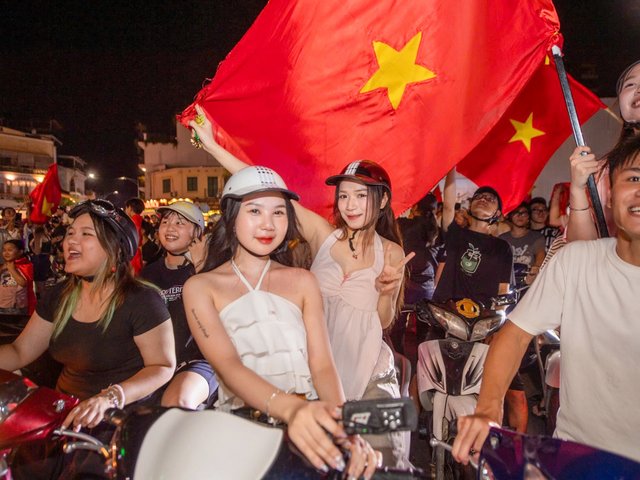 Sau khi tiếng còi mãn cuộc trận chung kết giữa U23 Việt Nam-U23 Indonesia vang lên, người hâm mộ đổ ra đường mừng chiến thắng của đội tuyển quốc gia.