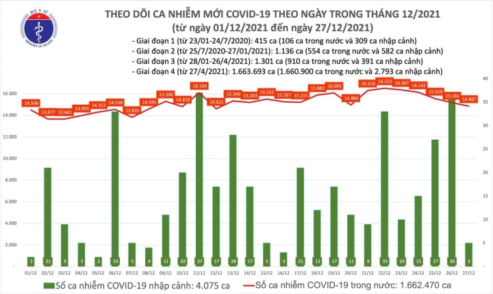 Như vậy, sau 24 giờ, Bình Định giảm 299 ca, Bình Dương giảm 153, Bến Tre giảm 149, Hải Phòng tăng 664, Phú Yên tăng 110, Sơn La tăng 107. Trung bình số ca nhiễm mới trong nước ghi nhận 7 ngày qua là 15.851 ca/ngày. Ngày 27/12, cả nước có 11.374 bệnh nhân được công bố khỏi bệnh.