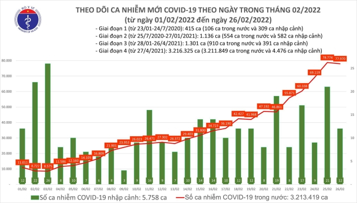 Như vậy, sau 24 giờ, Bắc Giang giảm 1.565 ca, Lạng Sơn giảm 1.046, Phú Yên giảm 777, Nghệ An tăng 1.561, Hà Nội tăng 947, Vĩnh Phúc tăng 628. Trung bình số ca nhiễm mới trong nước ghi nhận 7 ngày qua là 62.304 ca/ngày. Ngày 26/2, cả nước có 20.427 bệnh nhân được công bố khỏi bệnh.