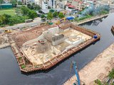 Đơn vị thi công dựng các tường thép kiên cố bao quanh khu vực công trình, chừa lại khoảng 8 mét lòng sông để đảm bảo dòng chảy không bị gián đoạn. Cấu trúc này vừa giúp thi công thuận lợi, vừa duy trì luồng lưu thông thủy trong suốt thời gian thực hiện.