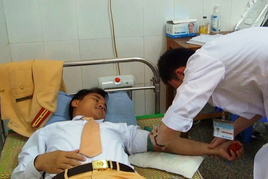 Thiếu tá Nguyễn Việt Hùng, cán bộ Công an huyện Quảng Xương (Thanh Hóa), tình nguyện hiến máu cứu người gặp tai nạn giao thông