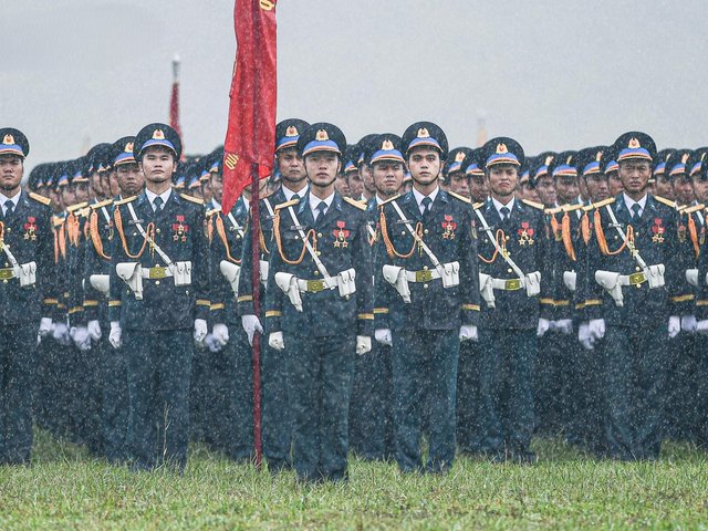 Dưới cơn mưa tầm tã sáng 16/8 ở Miếu Môn, hơn 16.300 chiến sĩ vẫn kiên cường giữ đội hình, hoàn thành xuất sắc buổi tổng hợp luyện diễu binh chuẩn bị Quốc khánh 2/9.