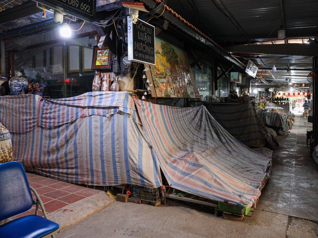 Kinh doanh ngày càng ế ẩm, các cửa hàng tại làng gốm Bát Tràng (Hà Nội) đang cố gắng bám trụ, nhưng nhiều quầy đã đóng cửa, phủ bạt, bán gián đoạn.