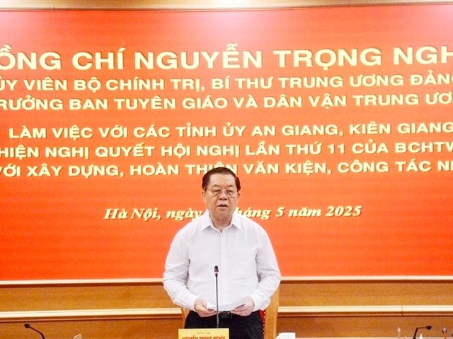 Ngày 28-5, Ủy viên Bộ Chính trị, Bí thư Trung ương Đảng, Trưởng ban Tuyên giáo và Dân vận Trung ương Nguyễn Trọng Nghĩa làm việc với các Tỉnh ủy: Kiên Giang, An Giang về thực hiện Nghị quyết Hội nghị lần thứ 11 của Ban Chấp hành Trung ương Đảng khóa XIII gắn với xây dựng, hoàn thiện văn kiện, công tác nhân sự.