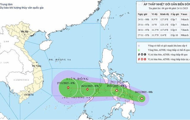 Cơ quan khí tượng thuỷ văn nhận định, áp thấp nhiệt đới sau khi vào Biển Đông có thể mạnh thành cơn bão số 15, hướng về đất liền Nam Trung Bộ.