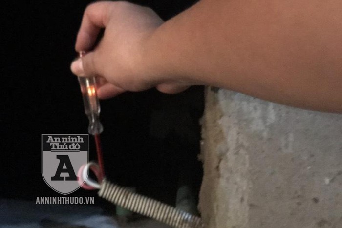 Khi kiểm tra trên đoạn dây điện màu trắng bằng bút thử điện, lực lượng Công an thấy đèn bút thử điện ở trạng thái sáng, chứng tỏ dây điện hở này có điện.