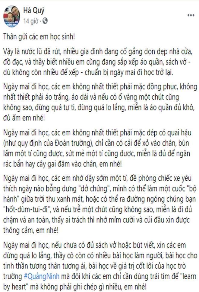 Ngày mai đi học, nếu chưa có đủ sách vở hoặc bút viết, xin các em đừng quá lo lắng, thầy cô còn có nhiều bài học làm người, bài học cho tinh thần tương thân tương ái, bài học về giá trị cốt lõi của học trò trường QuảngNinh mà đôi khi các em chỉ cần dùng trái tim để "learn by heart" mà không phải ghi chép gì nhiều, em nhé!", thầy Hiệu trưởng viết.