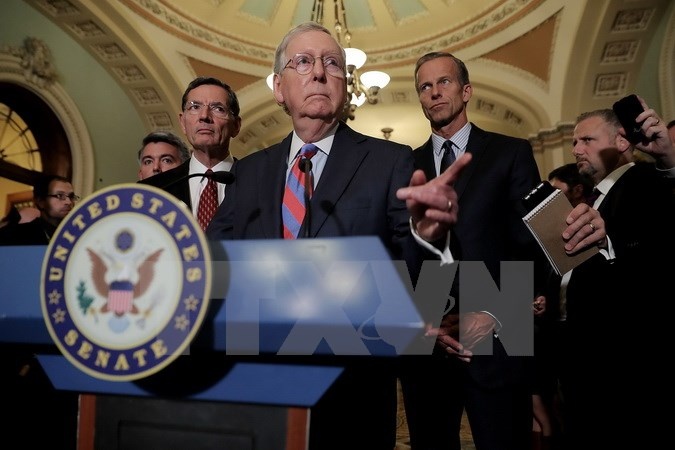 | Lãnh đạo đa số Thượng viện Mỹ Mitch McConnell (giữa) phát biểu với báo giới tại Washington ngày 3/10. (Nguồn: AFP/TTXVN) |