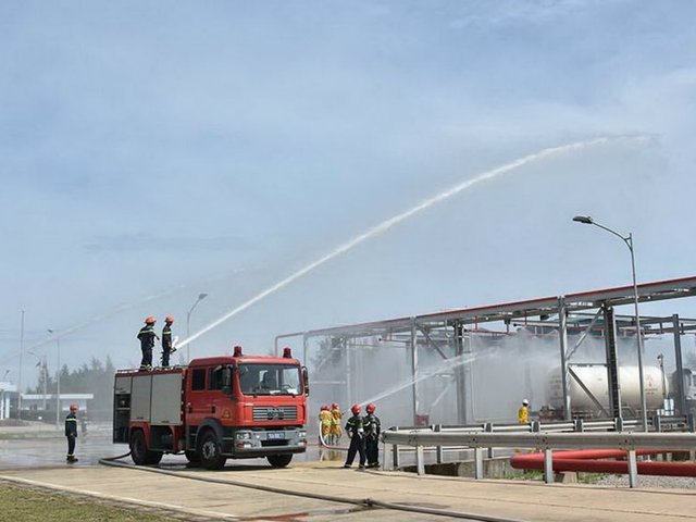 Công ty Cổ phần kinh doanh Khí miền Nam (PVGas South) - Chi nhánh miền Trung vừa phối hợp với Phòng Cảnh sát Phòng cháy chữa cháy (PCCC) và Cứu hộ cứu nạn số 2 – Công an tỉnh Quảng Ngãi tổ chức diễn tập phương án PCCC tại Kho chứa khí LPG Dung Quất, tỉnh Quảng Ngãi.