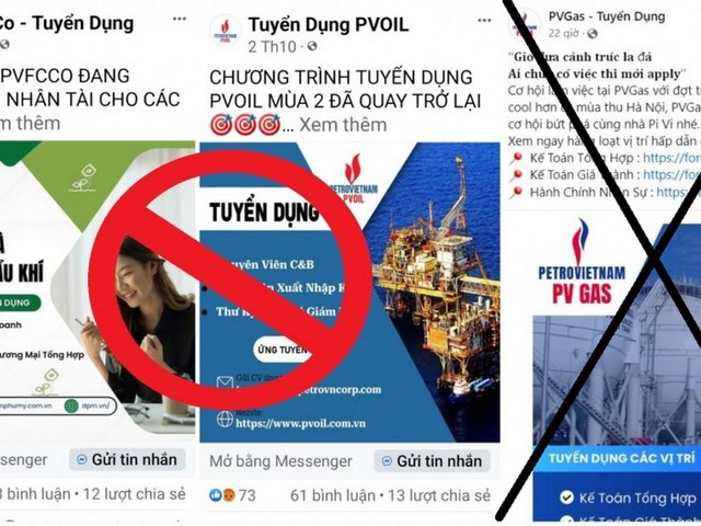 Hiện nay, trên mạng xã hội Facebook xuất hiện một số đối tượng giả mạo thương hiệu các đơn vị Dầu khí như: Tổng công ty Khí Việt Nam (PV GAS), Tổng công ty Dầu Việt Nam (PVOIL), Tổng công ty Phân bón Hóa chất Dầu khí (PVFCCo),… đăng thông tin tuyển dụng trên các fanpage giả mạo nhằm lừa đảo, chiếm đoạt tài sản của người ứng tuyển.