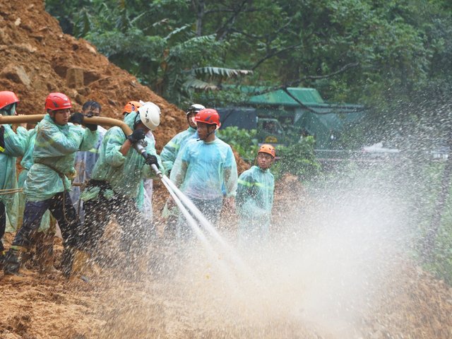 Cán bộ, chiến sỹ dầm mưa xử lý hiện trường vụ sạt lở đèo Bảo Lộc để thông xe