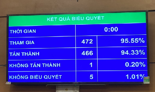Với 466/472 Đại biểu Quốc hội tham gia biểu quyết tán thành (chiếm 94.33%), trong phiên họp sáng nay, 20-6, Quốc hội đã chính thức thông qua Luật Hợp tác xã sửa đổi.