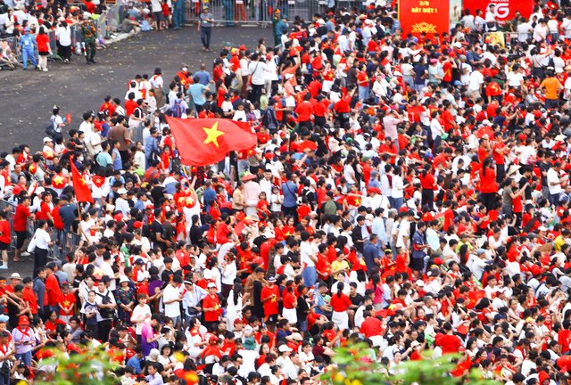 Hàng vạn người trong sắc áo cờ đỏ sao vàng, vẫy cờ Tổ quốc cùng hát vang các ca khúc cách mạng tạo nên bầu không khí sôi động trước giờ tổng hợp luyện A80 lần hai.
