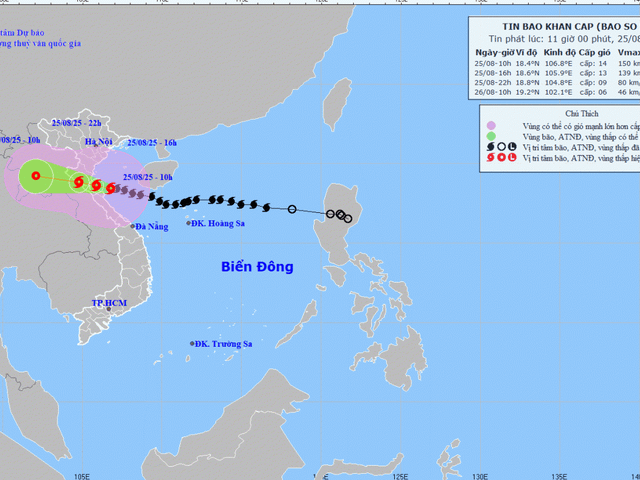 Bão số 5 Kajiki tiếp tục mạnh thêm, cường độ lúc 9h đạt cấp 12-13, giật cấp 16, đồng bằng Bắc Bộ, Nam Phú Thọ, Thanh Hóa đến TP Huế mưa lớn diện rộng từ đêm nay.