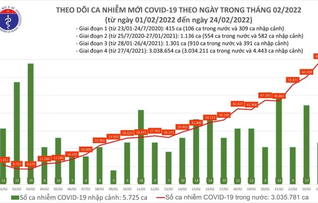 Chiều 24/2, Bộ Y tế công bố thêm 69.128 ca COVID-19 mới, trong đó 69.119 ca ghi nhận trong nước.