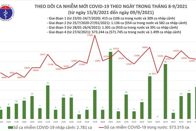 Chiều 9/9, Bộ Y tế công bố thêm 12.420 ca COVID-19, trong đó 12.399 ca ghi nhận trong nước.