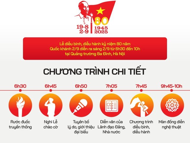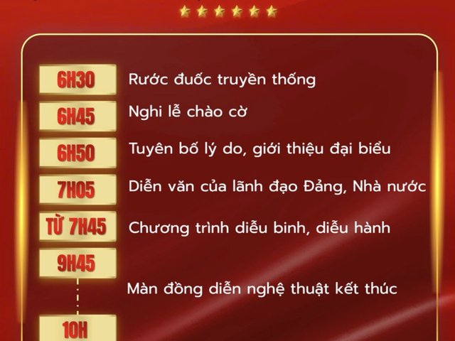 Lễ kỷ niệm, diễu binh, diễu hành Quốc khánh 2/9 bắt đầu lúc 6h30 với màn rước đuốc truyền thống và kết thúc lúc 10h bằng màn đồng diễn nghệ thuật.
