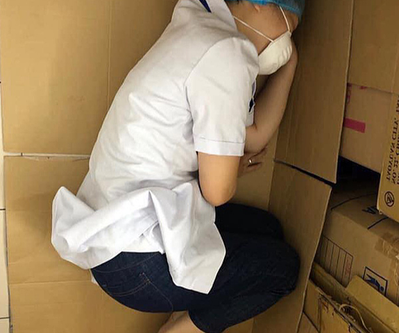 Nữ điều dưỡng Đà Nẵng ngủ gục trên tấm các tông