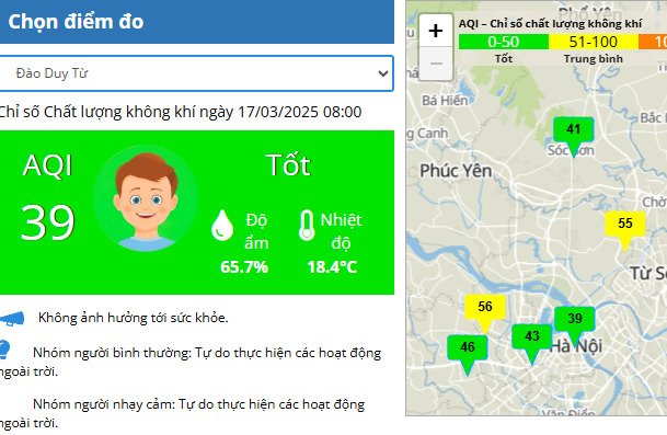 Sáng 17-3, chất lượng không khí trên địa bàn thành phố Hà Nội ổn định ở ngưỡng tốt và trung bình. Chỉ số AQI các khu vực dao động quanh mức 39-62.